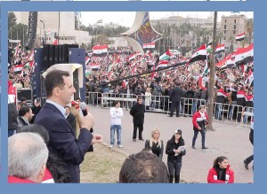 كانت الذروة في 7 شباط المنصرم، عندما دعا النظام إلى تظاهرة جمعت مئات الألوف ترحيباً بوزير الخارجية الروسي سيرغي لافروف في دمشق. كانت إحدى أبرز دعايات دعم النظام والوقوف إلى جانب الجيش رفع شعارات التخويف من عسكرة المعارضة والتفجيرات الانتحارية.